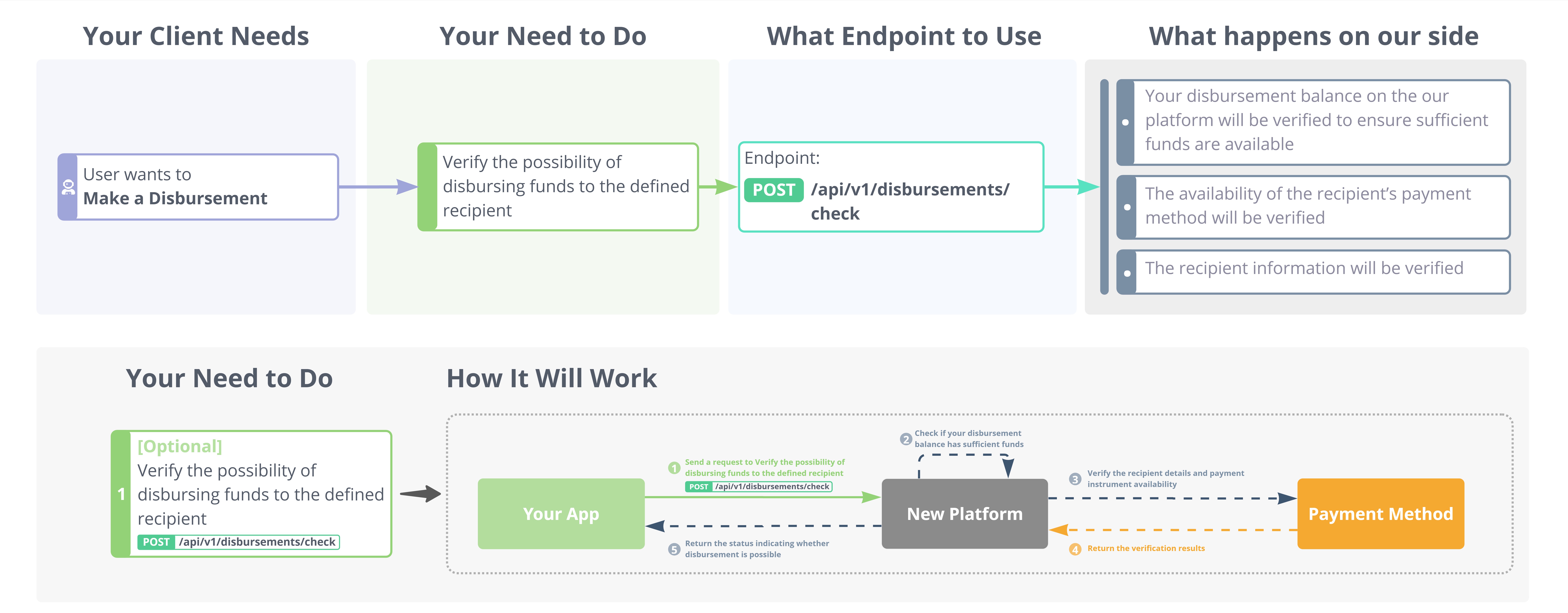 Single-transaction check:Each verification request can be used to check only one disbursement. If you need to validate multiple disbursements, send separate requests for each.