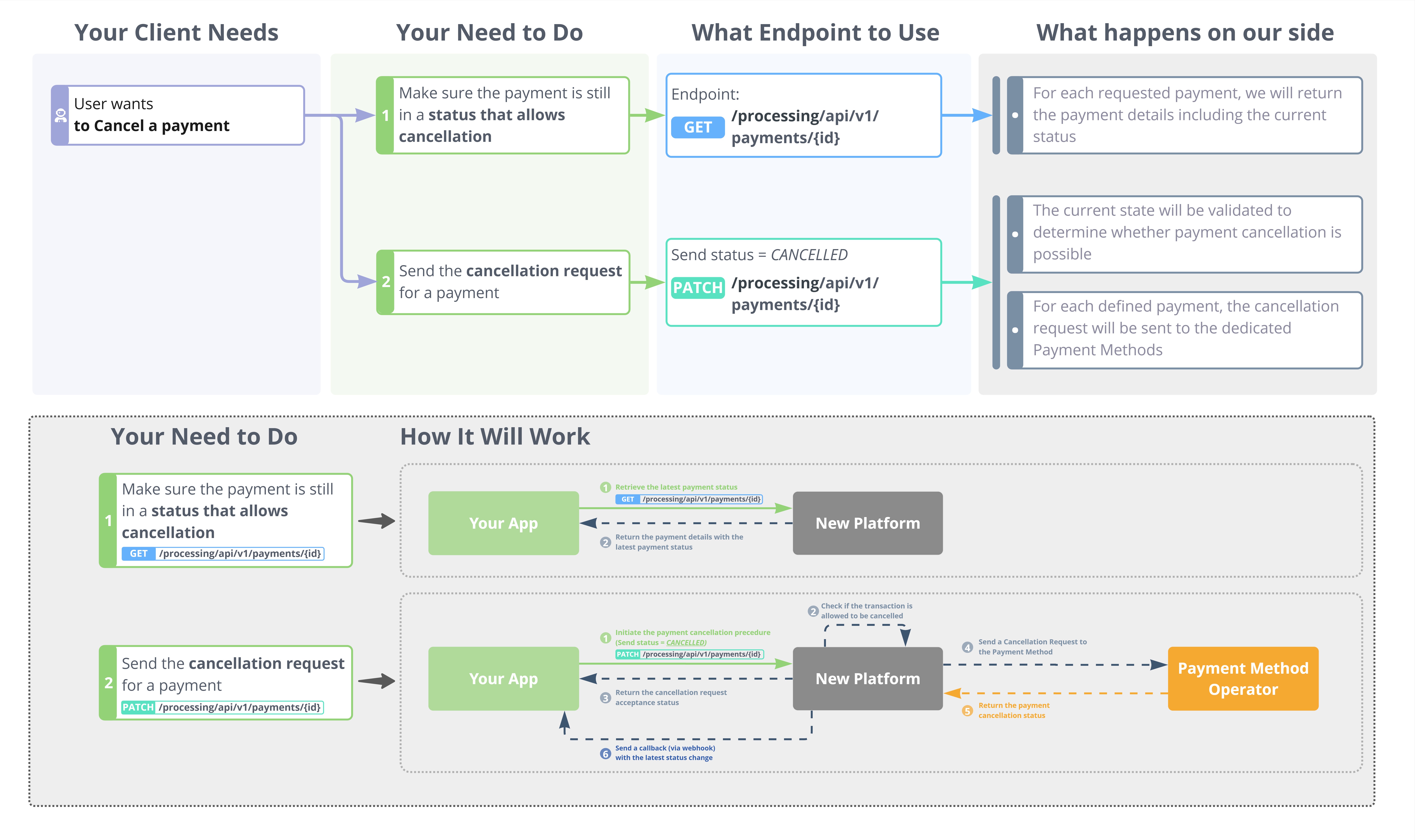 PATCH /api/v1/payments/{id} | Initiate the cancellation of the payment and the release of the authorised amount |