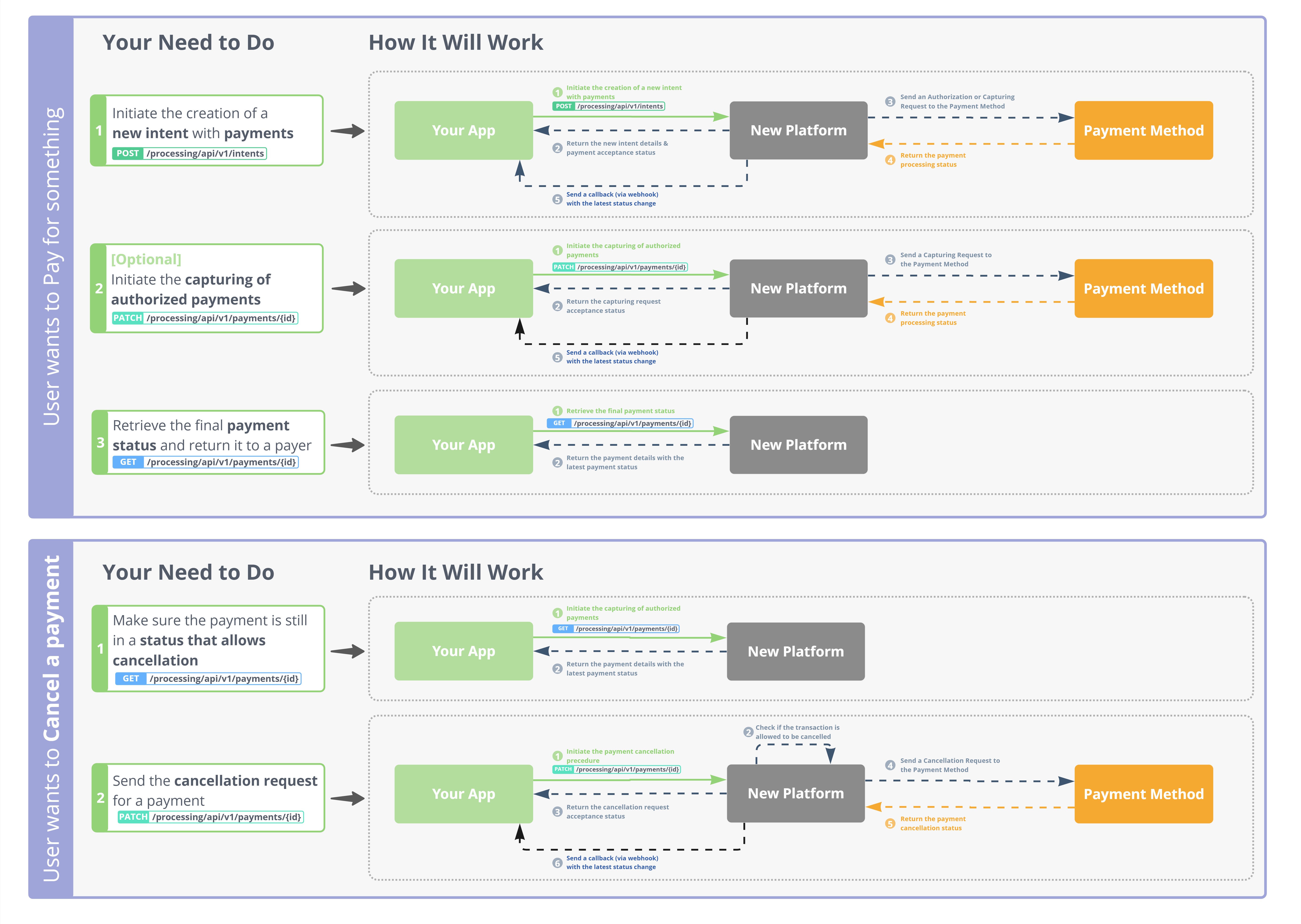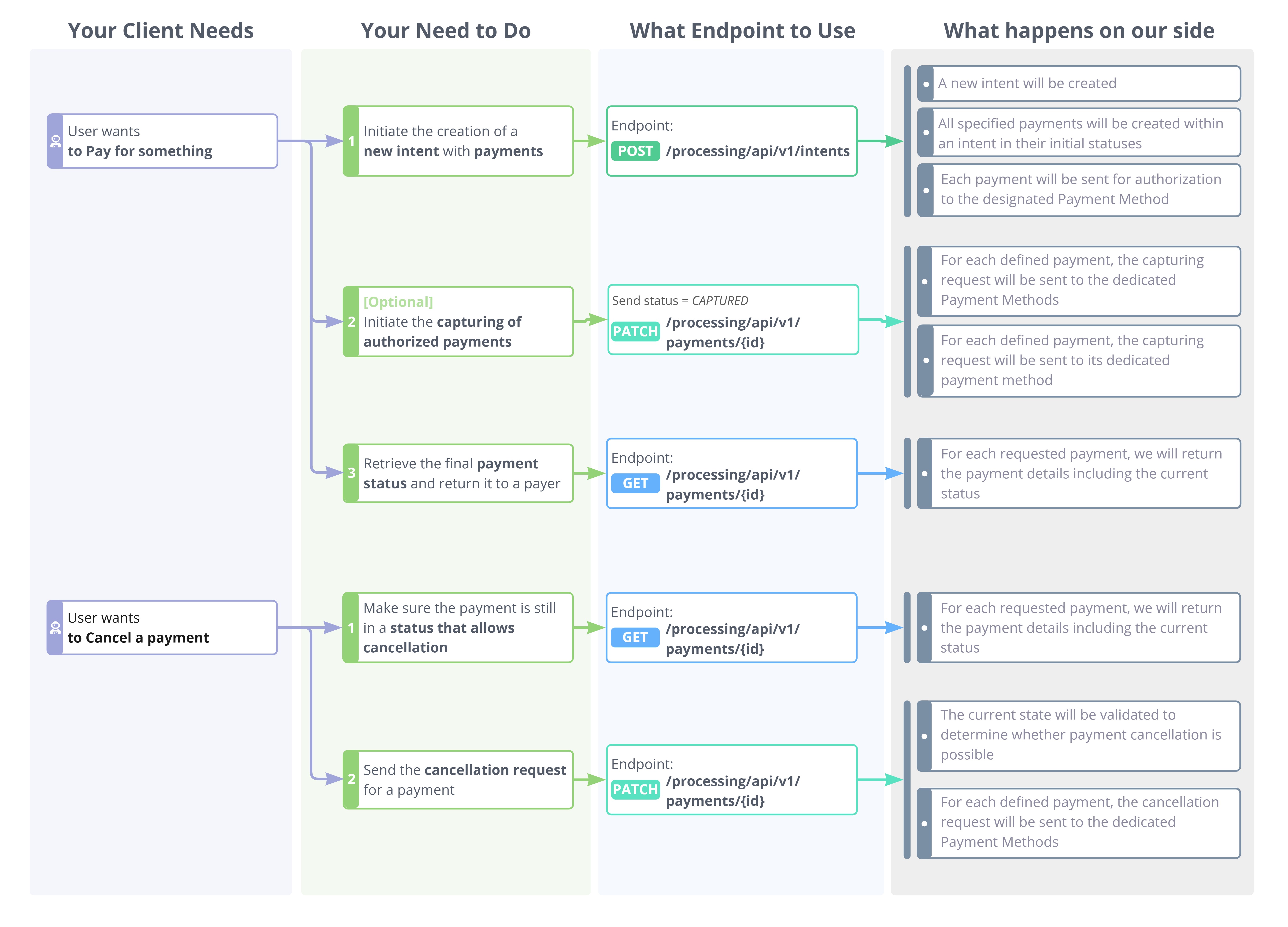 PATCH /processing/api/v1/payments/{id} | Initiates a payment status change. Possible values include: CAPTURED, CANCELLED |