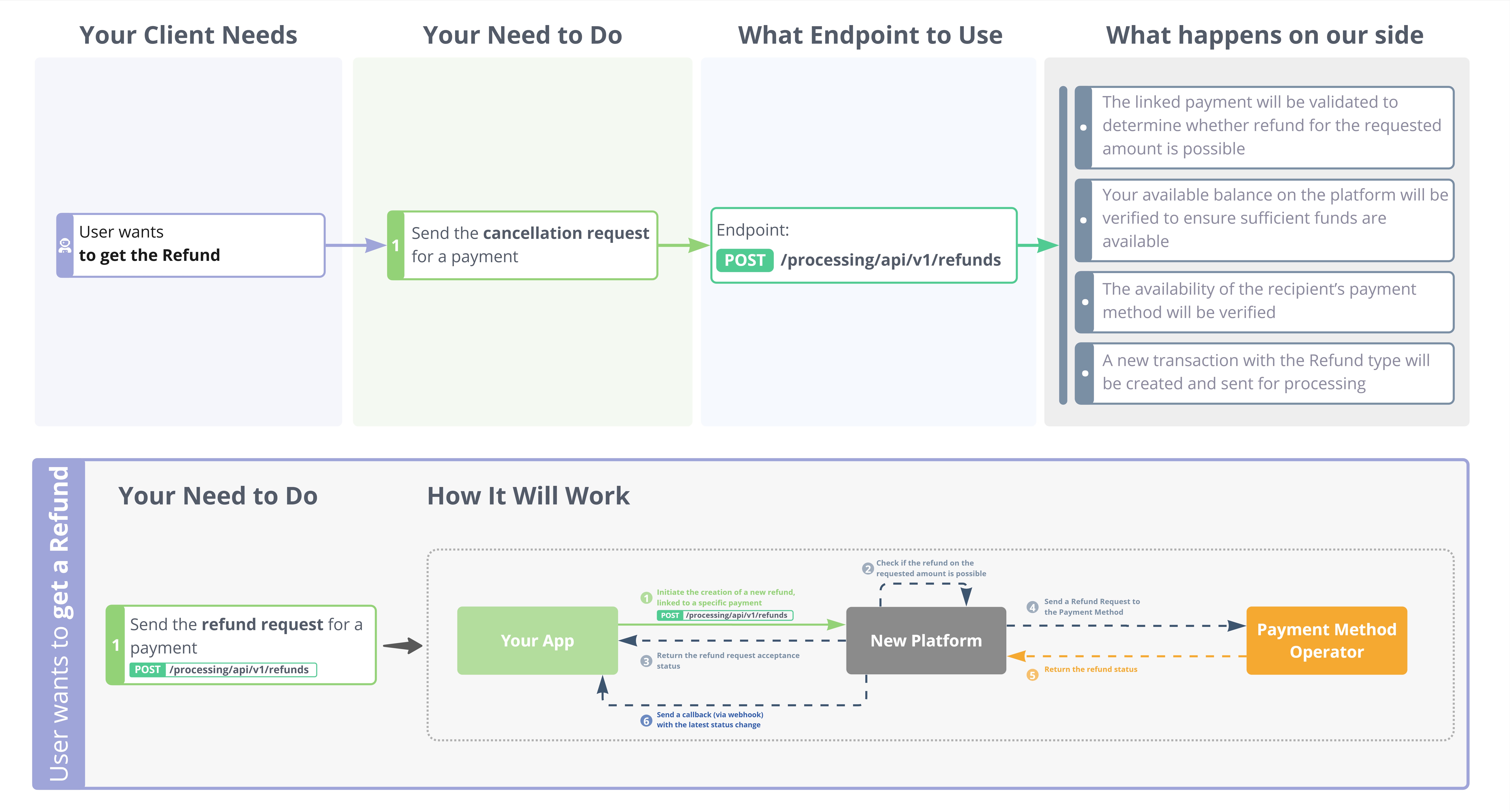 - The refund process involves internal validation (e.g. transaction eligibility, account balance) and subsequent submission to the Payment Method Operator.